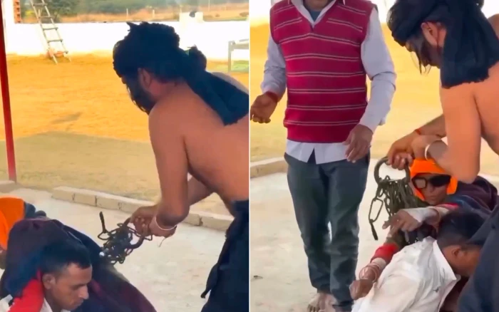 Read Moreصحيفة المرصد:وثّق مقطع فيديو متداول لحظة اعتداء “معالج روحاني” هندي على شاب ووالدته، مستخدمًا قطعًا حديدية مربوطة ببعضها، بزعم إخراج المس.وأظهر المقطع المعالج وهو ينهال بالضرب على الشاب في كتفه وظهره، قبل أن تتدخل والدته لحمايته، إلا أنه اعتدى عليها أيضًا بالطريقة نفسها.وبحسب المتداول، كانت امرأة مسنة قد لجأت إلى المعالج طلبًا لعلاج ابنها، إلا أن الأمر انتهى بتعرضهما للضرب، بعد أن ادّعى قدرته على طرد الأرواح الشريرة من الابن ثم من الأم. صحيفة المرصد:وثّق مقطع فيديو متداول لحظة اعتداء “معالج روحاني” هندي على شاب ووالدته، مستخدمًا قطعًا حديدية مربوطة ببعضها، بزعم إخراج المس.وأظهر المقطع المعالج وهو ينهال بالضرب على الشاب في كتفه وظهره، قبل أن تتدخل والدته لحمايته، إلا أنه اعتدى عليها أيضًا بالطريقة نفسها.وبحسب المتداول، كانت امرأة مسنة قد لجأت إلى المعالج طلبًا لعلاج ابنها، إلا أن الأمر انتهى بتعرضهما للضرب، بعد أن ادّعى قدرته على طرد الأرواح الشريرة من الابن ثم من الأم.