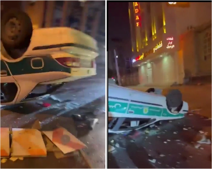 أظهر مقطع فيديو انقلاب سيارة تابعة للشرطة الإيرانية في الأحواز.عمليات تدميرو وثق المقطع عمليات تدمير شاملة لقوات الأمن، حيث بدت الشوارع خالية تماما منهم.