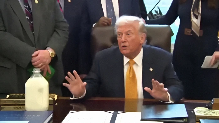 وقال ترامب على هامش المؤتمر الصحفي: «لدينا بعض الحليب هنا، لقد ظل موجودًا لمدة 5 أيام، أحضرته حتى يتمكن الصحفيون من الحصول على بعضٍ منه، يمكنكم شربه كله، إنه طازج جدًا… عمره فقط 5 أيام».