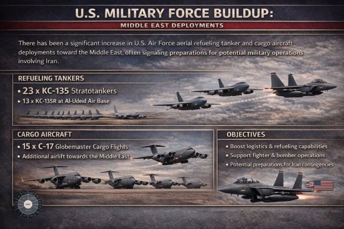 • 15 رحلة شحن جوي من طراز C-17 متجهة إلى الشرق الأوسط لدعم القدرات اللوجستية.ويأتي هذا الارتفاع في وتيرة التحركات الجوية متوافقًا مع أنماط الانتشار التي تسبق عادةً العمليات العسكرية الكبرى، ما يثير تساؤلات حول طبيعة المرحلة المقبلة في المنطقة.