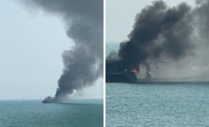 بالفيديو.. احتراق فرقاطة إيرانية بعد استهدافها من قبل القوات الأمريكية بالقرب من ميناء بندر عباس