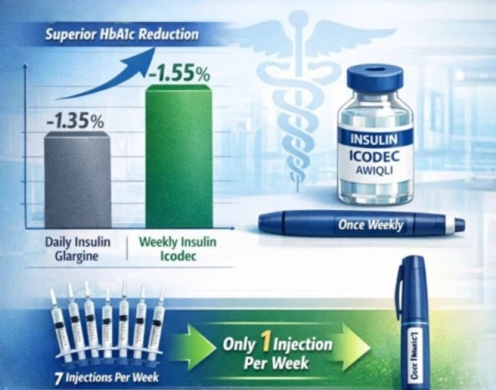 معدل الانخفاضوبلغ معدل الانخفاض 1.55% مقابل 1.35% بالإضافة إلى تقليل عدد الحقن بمقدار ٤ حقن أسبوعياً وذلك في المرحلة الثالثة من التجارب السريرية ONWARDS. صحيفة المرصد: وافقت إدارة الغذاء والدواء الأمريكية، على أول إنسولين قاعدي طويل المدى يعطى مرة واحدة أسبوعياً للمرضى الذين يعانون من مرض السكري من النوع الثاني.مستوى السكروأظهر إنسولين إيكوديك الذي يُعرف باسم Awiqli فعالية في خفض مستوى السكر التراكمي “A1” مقارنة بإنسولين غلارجين الذي يعطى يومياً.